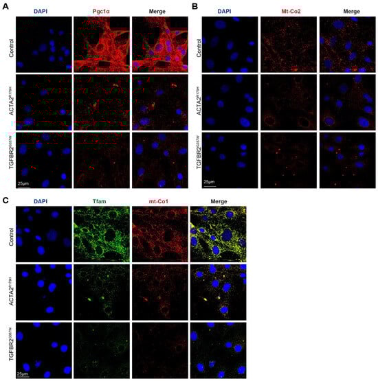 To investigate whether mitochondrial metabolism is affected in other thoracic aortic aneurysms and dissections (TAADs), we modeled familial thoracic aortic aneurysm and dissections (FTAAD) and Loeys–Dietz syndrome (LDS) by using lentivectors to overexpress human ACTA2R179H and TGFBR2G357W in primary murine aortic vascular smooth muscle cells (VSMCs). These constructs were generously provided by Mark Lindsay [10]. As shown in Figure 1, immunofluorescence analysis revealed a marked reduction in the protein levels of Pgc1α, Mt-Co2, Tfam, and Mt-Co1 in both ACTA2R179H and TGFBR2G357W mutant-transduced VSMCs compared to controls, suggesting impaired mitochondrial biogenesis and function in these disease models.