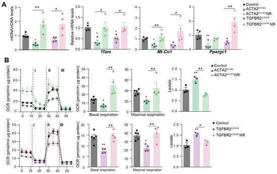 Nicotidamide riboside treatment improves mitochondrial function in VSMCs with thoracic aortic aneurysm mutations. The effect of NR on mouse primary VSMCs overexpressing ACTA2R179 or TGFBR2G357W (to model FTAAD and LDS, respectively). VSMCs were insolated and transduced with lentivectors. After 2 days of transduction, VSMCs were treated with NR (0.25 mg/mL) for 5 days. (A) qPCR analysis of relative mtDNA content and RT–qPCR analysis of Tfam, Mt-Co1 and Ppargc1a mRNA expression. (B) OCR measured using SeahorseTm at basal respiration and after addition of oligomycin (I) and FCCP (II) to measure maximal respiration, followed by a combination of rotenone and antimycin A (III). The right-most panel shows extracellular lactate levels. Data are mean ± s.e.m. Statistical significance was assessed by one-way ANOVA: * p < 0.05, ** p < 0.01 vs. Control; # p < 0.05, ## p < 0.01 vs. NR treatment.