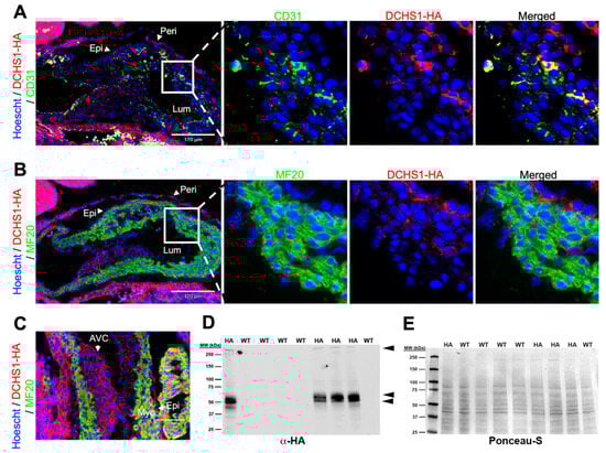 Mice with a targeted insertion of the hemagglutinin (HA) tag in the Dchs1 locus were used to assess endogenous expression throughout embryonic and postnatal life. At embryonic day 11.5 (E11.5), DCHS1-HA expression was observed along the endocardial and epicardial epithelium in the ventricular wall (Figure 1A,B). Prominent expression was also observed throughout the forming valve endocardium and interstitial mesenchyme of the developing atrioventricular (AV) cushions (Figure 1C). Uniform expression throughout the cushion tissue was evident. Confirmation of endothelial expression was observed through co-localization between DCHS1-HA and the pan-endothelial marker (including endocardial cells), CD31, but not detected between DCHS1-HA and the cardiomyocyte marker, MF20 (Figure 1B). By western analyses of whole heart tissue lysate, a high molecular weight band (>250 kDa) was observed, consistent with the predicted size for full-length DCHS1-HA, as well as additional smaller bands around 54 kDa and 50 kDa (Figure 1D).
