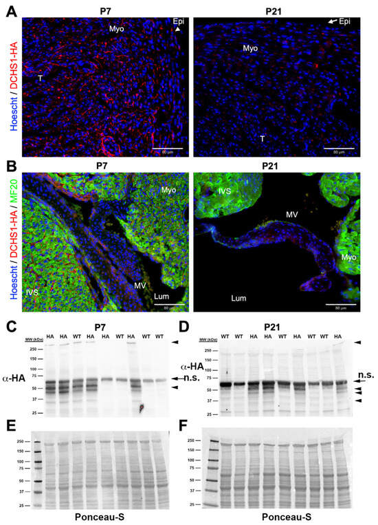 Adolescent and adult Dchs1 expression. (A,B) Post-natal LV free wall and mitral valves at day 7 (P7) and P21 mice were stained with HA (red) and MF20 (green). (C,D) Western analyses from whole-heart tissue lysates of pups from P7 and P21 probed for HA. Full length (>250 kDa) was barely detectable at this stage, and reduction in the smaller molecular weight is also apparent at both P7 and P21 (arrowheads). At these timepoints, additional smaller fragments are observed, indicating potential degradation of DCHS1. Arrow represents non-specific (n.s.) immunoreactive bands. (E,F) Ponceau-S stain showing equivalent protein loading, respectively. Labeled abbreviations: lumen (Lum), trabeculated myocardium (T), myocardium (Myo), epicardium (Epi), mitral valve (MV), and interventricular septum (IVS).