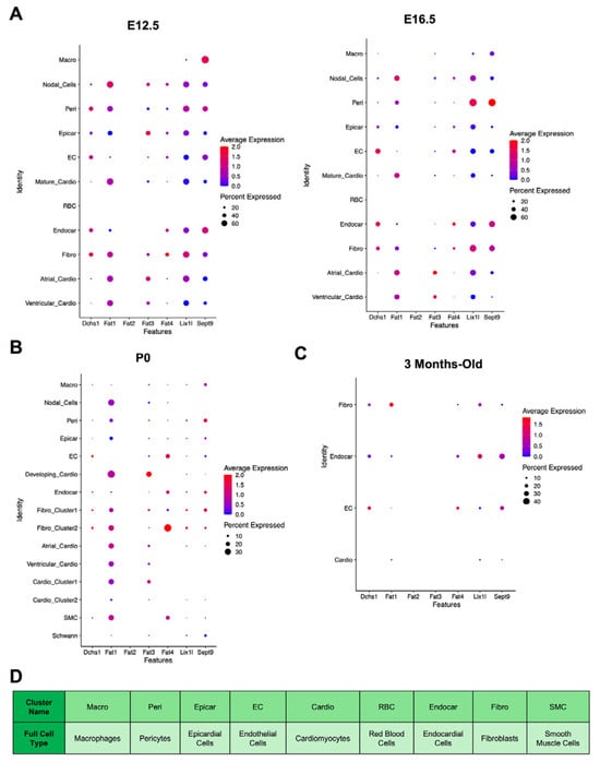 The expression of Dchs1 binding partners was also examined (Figure 6). Fat4, a known DCHS1 interactor, showed an overlapping expression pattern with Dchs1, being detected in endothelial, endocardial, and fibroblast populations across all stages. Fat1 was broadly expressed in most cell types across development, excluding endothelial cells at P0 (Figure 6B) and macrophages during embryogenesis (Figure 6A). Fat2 mRNA was absent at all stages. Fat3 was specifically expressed in cardiomyocyte clusters and epicardial cells at E12.5, but not in Dchs1-expressing populations (Figure 6A). Lix1l and Sept9, genes implicated in PCP-related signaling and previously shown to interact with the cytoplasmic tail of Dchs1, were broadly expressed in most clusters at all stages, except for red blood cells during embryogenesis and mature cardiomyocytes/nodal cells at P0 (Figure 6B).
