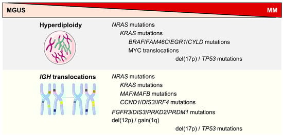 Genomic events at disease initiation and progression from MGUS to MM. Hyperdiploidy could be a first-hit event that facilitates the addition of secondary events, such as mutations in NRAS, KRAS, and BRAF. Similarly, translocations involving the immunoglobulin heavy chains (IGH) gene could be a different primary event that more frequently is associated with mutations in MAF/MAFB, FGFR3, or CCND1 genes, as well as with gains of 1q. TP53 mutations and/or del(17p) are usually late pathogenic events, occurring in both cases.