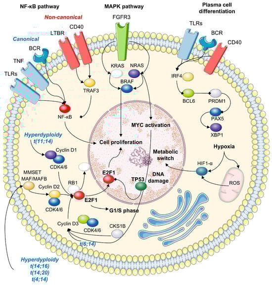 Pathways altered in MM. Principal pathways involved in high-risk disease, including NF-κB, MAPK, cell cycle, hypoxia, and DNA-damage repair pathways. In detail, the absence of TP53 results in the lack of cell cycle control through E2F1 and Cyclin D3, and cells continue to the G1/S phase even though they carry DNA breaks, thus promoting genomic instability, impaired DNA repair, and apoptosis resistance. The t(4;14), t(14;16), and t(14;20) translocations lead to MMSET and MAF/MAFB overexpression, ultimately leading to increased E2F1 activation and translocation to the nucleus, where it promotes the transcription of genes involved in cell proliferation. Similarly, hypodiploidy and t(11;14) promote cell cycle progression and proliferation through Cyclin D1/CDK4/9 modulation. Upregulation and/or activating mutations in FGFR3, KRAS, NRAS, and/or BRAF, and MYC translocations induce cell proliferation by direct gene transcription or by indirectly modulating cyclin activities, as well as TRAF3 and NF-κB. Moreover, altered BCR signaling is related to impaired apoptosis through modulation of IRF4, BCL-6, and PAX5. Finally, hypoxia can also influence RNA splicing of genes for DNA damage repair proteins via upregulation of HIF1α and lactate dehydrogenase A. Figure made using https://smart.servier.com/.
