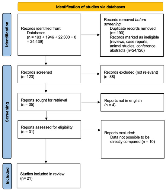 The initial database search yielded 24,439 records, including 193 from PubMed, 1946 from Scopus, and 22,300 from WoS. Following automated and manual duplication removal (n = 190) and the first rejection of irrelevant publication genres, such as reviews, conference abstracts, case reports, and animal-only studies (n = 24,126), a total of 123 records were left for title and abstract screenings. Following screening, 88 articles were removed because they did not match the inclusion criteria or did not answer the review question. The entire texts of the remaining 35 records were obtained for eligibility determination. Four full-text papers were selected because they were not available in English, and another ten were excluded owing to insufficient methodological information, a lack of relevant outcome data, or the use of non-follicular samples. Finally, 21 papers passed all the eligibility requirements and were included in the final qualitative synthesis.