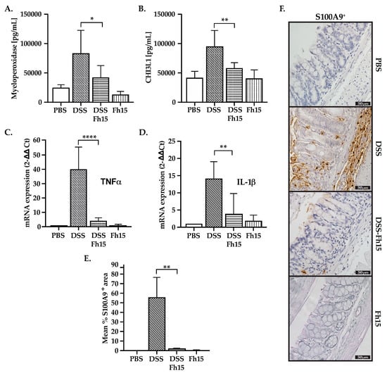 3.4. Fh15 Decreases Serum Levels of Myeloperoxidase and CHI3L1 While Suppressing S100A9 and Pro-Inflammatory Cytokines in Colonic Tissues of DSS-Induced UC Mice