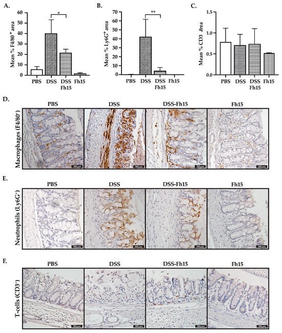 Figueroa-Gispert MDM, Ramos-Lugo CM, Ocasio-Malavé C, Scott RP, Ahrendsen JT, Gomez-Samblas M, Osuna A, Dorta-Estremera SM, Espino AM. Fh15 Reduces Colonic Inflammation and Leukocyte Infiltration in a Dextran Sulfate Sodium-Induced Ulcerative Colitis Mouse Model. Cells. 2025; 14(11):799. https://doi.org/10.3390/cells14110799