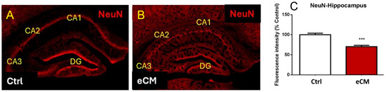 The hippocampus, located in the medial temporal lobe, is involved in memory and cognitive function [36,37]. Regions of the hippocampus such as the dentate gyrus (DG) and cornu ammonis (CA) regions, which are central to the cognitive and memory networks, maintain a continuous replenishment of neurons. Hippocampal DG’s newborn neurons are continuously added and develop into granule neurons that progressively extend their axons towards the CA2 and CA3 regions of the hippocampus [38]. Disruption of this process of neurogenesis can lead to seizure activity and cognitive dysfunction [39]. Neuro-inflammation may affect the brain during critical periods of brain development, pathological mechanisms that as occurs in CM, leading to alteration of newborn granule neurons, influencing survival, maturation and replacement of newborn neurons with subsequent long-term neuronal disturbances [40,41]. As memory and learning deficits have been observed in CM survivors, as well in murine experimental CM models [6,9,12,13,14,15,16,42,43], this study focuses on the hippocampal formation neuronal biology.
