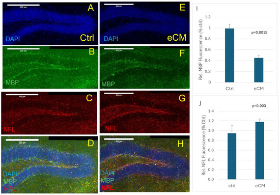 Neuronal damage in the hippocampal DG area. Showing increased NFL (red) immunostaining (C,G) as well as decreased MBP (green) (B,F) immunostaining at eCM (E–H) compared to control (A–D). Merged pictures shown in (D,H). Quantification of immunostaining in the DG center for MBP ((I), p = 0.0015) and NFL ((J), p = 0.003) for eCM compared to control (n = 3 per group). Mean ± SEM, Bar is 200 microns.