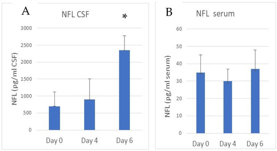 Concomitantly with the decline of NeuN immunostaining, the appearance of neurofilament light chain (NFL) fragments can be followed in cerebrospinal fluid (CSF) (Figure 4A). As determined by ELISA, about a 4-fold increase in the presence of NFL was observed in the CSF of the eCM mice on day 6 compared to the control mice (p < 0.05). The concentration of NFL in serum was much lower than in the CSF, and no significant difference in serum NFL concentrations were observed in eCM compared to non-infected control mice (Figure 4B).