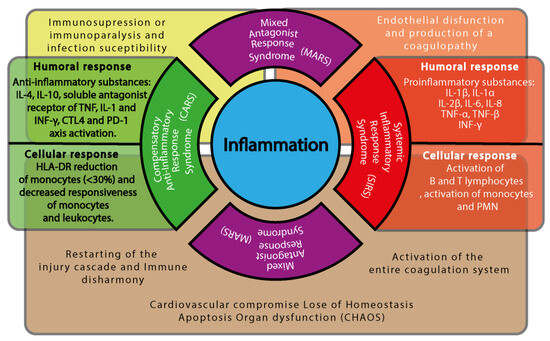 Immune cascade components and shock progression. This diagram illustrates the dynamic interplay between inflammatory and anti-inflammatory responses during shock, highlighting the transition from adaptive immune modulation to pathological dysregulation. At the center of the figure is a blue circle labeled “Inflammation”, representing the immunological core of the shock state. Surrounding it are four semicircular domains, each corresponding to a phase of the immune response. To the right, a red semicircle represents the Systemic Inflammatory Response Syndrome (SIRS), associated with the activation of the entire coagulation system. Adjacent to it, a red rectangular panel outlines the humoral response (e.g., pro-inflammatory mediators) and the cellular response (e.g., activation of neutrophils, monocytes, and endothelial cells). To the left, a green semicircle represents the Compensatory Anti-inflammatory Response Syndrome (CARS), linked to immune disharmony and the reactivation of injury cascades. A green rectangular panel describes the corresponding humoral response (e.g., anti-inflammatory cytokines) and cellular response (e.g., suppression of antigen presentation, T-cell deactivation). Above and below, two identical purple semicircles denote the Mixed Antagonist Response Syndrome (MARS), in which both pro- and anti-inflammatory responses coexist, leading to immune dysregulation. MARS is centrally associated with the development of CHAOS (Cardiovascular Compromise, Loss of Homeostasis, Apoptosis, Organ Dysfunction, and Immune Suppression). Behind the semicircular domains, a semi-transparent horizontal brown rectangle spans the figure, symbolizing systemic consequences that emerge as the immune syndromes overlap. Beneath CARS, the figure highlights immune disharmony and the reactivation of injury cascades. Beneath MARS, it shows the emergence of CHAOS. Beneath SIRS, it depicts coagulation system activation. Overlaying the upper portion of the immune domains are two semi-transparent bars that depict systemic clinical outcomes: A yellow bar above CARS and MARS indicates immune suppression or paralysis and increased susceptibility to infections. An orange bar above SIRS and MARS indicates endothelial dysfunction and the development of coagulopathy. Together, this figure emphasizes that these immune syndromes are not isolated stages but overlapping domains, each with its own systemic repercussions, which collectively shape the clinical trajectory of patients in shock.