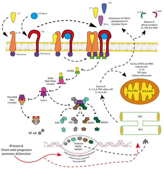 SIRS signaling: inflammatory pathways during shock and cytokine storm and the production of soluble cytokine receptor antagonists. Damaged tissue during the first hit releases pattern recognition receptors (PRRs), which initially activate Toll-like receptors (TLRs) on immune system cells (antigen-presenting cells, T cells, B cells, regulatory T cells, etc.). These, in turn, promote the release of pro-inflammatory cytokines, with the magnitude of this inflammatory response depending on both the extent of the first hit and the patient’s pre-existing comorbid state. Regardless of the scenario, the immune system initiates signaling pathways that involve the dimerization and activation of cytokine and Toll-like receptors (TLRs). Through their intracellular Toll/interleukin-1 receptor (TIR) domain, these receptors facilitate the formation of signaling platforms that enable the phosphorylation of MyD88. Once phosphorylated, MyD88 triggers the formation and activation of the IRAK4/IRAK1/IRAK2 complex, which subsequently interacts with TRAF6. TRAF6, in turn, activates two critical pathways: (1) the IKKα/IKKβ/IKKγ complex, leading to NF-κB phosphorylation and activation, and (2) the MAPK signaling pathway, involving ASK1, TAK1, MEKK1, and MEKK3. Both pathways synergistically enhance the cellular response to stress, promoting pro-inflammatory activity, oxidative stress (ROS and RNS) in the endoplasmic reticulum and mitochondria, and the release of inflammatory mediators. While this response is initially necessary for damage containment and tissue repair, its persistence can lead to an excessive pro-inflammatory state. Depending on the cell type undergoing this adaptive process (endothelial cells, epithelial cells, immune cells, or damaged cells) and the duration of shock progression, the inflammatory response may become overwhelming, leading to a dominant SIRS state. This results in an excessive release of pro-inflammatory cytokines, culminating in a cytokine storm, which, rather than being protective, exacerbates tissue damage and systemic inflammation. Graphical elements: Solid red arrows indicate the direct effect of ischemia/reperfusion injury and shock progression. Dashed red arrows represent the resulting intracellular oxidative damage. Black dashed arrows with triangular heads indicate signal transduction activation between receptors and intracellular mediators. Black dashed arrows with double heads represent cyclic organelle damage and feedback mechanisms. These arrows help visualize the direction and intensity of molecular events described above.