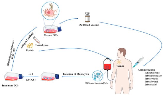 Regardless of the types of DC-based vaccines, the production of DC vaccines involves several key steps, as illustrated in Figure 1. Initially, DC precursors are extracted from peripheral blood and cultured to yield autologous iDCs. Subsequently, these iDCs undergo maturation in vitro by introducing a mix of cytokines, toll-like receptor (TLR) agonists, and other stimulatory substances, such as granulocyte-macrophage colony-stimulating factor (GM-CSF), IL-4, IL-6, TNF-α, prostaglandin E2 (PGE2), poly (I:C), LPS, or CD40 ligand [,,,]. After maturation, tumor-associated antigens (TAAs) are introduced to the DCs through co-culturing with peptides, proteins, tumor lysates, or whole tumor cells. Finally, the matured antigen-loaded DCs are harvested and administered to the patient as a therapy vaccine (Figure 1).