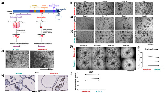 (a) Schematic of the organoid culture process using samples of endometrial scratch and menstrual blood from the same cycle. (b) Growth of menstrual organoids obtained directly from menstrual blood. (c) Growth of organoids from frozen menstrual blood, (d) and scratch, samples of the same patient. (e) Organoids derived from endometrial scratch and menstrual blood of the same patient are morphologically indistinguishable. Image shows organoids seeded from a single cell (5000 cells per 20 µL Matrigel drop) after 9 days of growth. (f) Single cell assay comparing growth of paired menstrual organoids and scratch organoids derived from four patients. (g) Quantification of single cell assay. Quantified 5 to 8 well repeats per condition. (h) Representative images of immunostaining for the proliferation marker Ki67 in menstrual organoids and scratch organoids from one patient. (i) Quantification of Ki67 proliferation index in menstrual organoids and scratch organoids of three patients. The image is adopted from Cindrova-Davies Tazangi et al., 2021, with copyright permission under the terms of the CC BY NC ND 4.0 license [18].