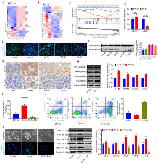 In vitro, 5% oxygen promoted glycolysis in bSCs and promoted lactate accumulation. (A): Heatmap of differentially expressed genes related to glycolysis in transcriptomic sequencing data; (B): Heatmap of differentially expressed genes related to oxidative phosphorylation in transcriptomic sequencing data; (C): GSEA of glycolysis and oxidative phosphorylation pathways; (D): qPCR results of LDHA and LDHB gene expression levels in bSCs cultured at 5% and 21% oxygen concentrations; (E,F): Immunofluorescence staining (E) and WB (F) results analyzing the effects of different oxygen concentrations on the key protein LDHA in bSCs glycolysis; (G): Immunohistochemistry analysis of the difference in glycolytic levels in the seminiferous tubules of adult and adolescent buffalo testes; (H): WB analysis of the effects of 5% and 21% oxygen concentrations on the expression of glycolysis-related proteins in bSCs; (I): After intracellular lactate metabolism was blocked with DCA, the changes in lactate levels of bSCs in each group were observed; (J): Brightfield analysis and LDHA fluorescence staining of the cells in each group; (K): Flow cytometric analysis of the effect of DCA blocking lactate metabolism on cell apoptosis; (L): WB analysis of the effect of DCA blocking lactate metabolism on the expression of proteins related to the glycolytic process. [Abbreviations: LDHA: Lactate Dehydrogenase A. LDHB: L-lactate Dehydrogenase B Chain. HK-2: Hexokinase II. HIF-1α: Hypoxia Inducible Factor 1 Subunit Alpha. PKM2: Pyruvate Kinase M2 Isoform. PDK2: Pyruvate Dehydrogenase Kinase Isoform 2. Magnification: 200×, scale bar = 50 μm; “ns” denotes no significant difference (p > 0.05); “*” indicates statistical significance (p < 0.05); “**” indicates highly significant difference (p < 0.01); different letters represent significant differences between groups (p < 0.05)].