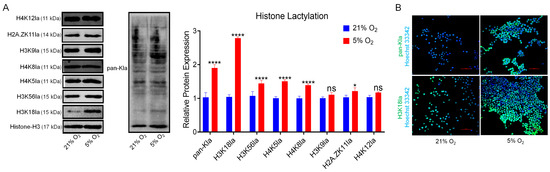 In vitro, 5% oxygen promoted an increase in H3K18la histone lactic acid modification in bSCs. (A): WB analysis of the effects of 5% and 21% oxygen concentrations on the lactic acid modification of histones and total proteins in bSCs; (B): Immunofluorescence analysis of the effects of 5% and 21% oxygen concentrations on lactic acid-modified total proteins and H3K18la proteins in bSCs. [Abbreviations: H4K12la: Histone H4 lysine 12 lactylation. H2A.ZK11la: Histone H2A variant Z lysine 11 lactylation. H3K9la: Histone H3 lysine 9 lactylation. H4K8la: Histone H4 lysine 8 lactylation. H4K5la: Histone H4 lysine 5 lactylation. H3K56la: Histone H3 lysine 56 lactylation. H3K18la: Histone H3 lysine 18 lactylation. pan-Kla: Pan-histone lysine lactylation. Magnification: 200×, scale bar = 50 μm; “ns” denotes no significant difference (p > 0.05); “*” indicates statistical significance (p < 0.05); “****” indicates extremely significant difference (p < 0.0001); magnification: 200×, scale bar = 50 μm].
