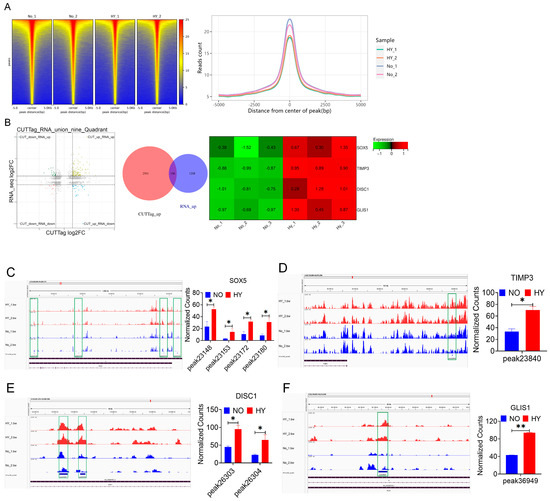 CUT&TAG-seq combined with RNA-seq technology revealed that a 5% oxygen concentration in vitro promoted the proliferation of bSCs in vitro by activating H3K18la lactic acid expression. (A): Signal heatmap near the center of each group peak and signal distribution map near the center of the peak; (B): Nine-quadrant map of CUT&RNA joint analysis, up-up Venn diagram and RNA-seq screening heatmap of differentially expressed genes; (C–F): Integrative Genomics Viewer (IGV) visualization results of each site of the enriched differentially expressed genes SOX5 (C), TIMP3 (D), DISC1 (E) and GLIS1 (F) and relative quantitative results of CUT&Tag enrichment normalized counts. [Abbreviations: SOX5: SRY-Box Transcription Factor 5. TIMP3: Tissue Inhibitor of Metalloproteinases 3. DISC1: Disrupted in Schizophrenia 1. GLIS1: GLIS Family Zinc Finger 1; “*” indicates statistical significance (p < 0.05); “**” indicates highly significant difference (p < 0.01); The green box in the figure represents the enrichment curve differences of differentially expressed sites visualized in the IGV image. It highlights regions where differential expression peaks are enriched, reflecting variations in gene regulation or chromatin features across samples].
