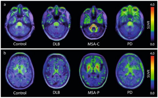 - Smith, R.; Capotosti, F.; Schain, M.; Ohlsson, T.; Vokali, E.; Molette, J.; Touilloux, T.; Hliva, V.; Dimitrakopoulos, I.K.; Puschmann, A.; et al. The α-Synuclein PET Tracer [18F] ACI-12589 Distinguishes Multiple System Atrophy from Other Neurodegenerative Diseases. Nat. Commun. 2023, 14, 6750. [Google Scholar] [CrossRef]