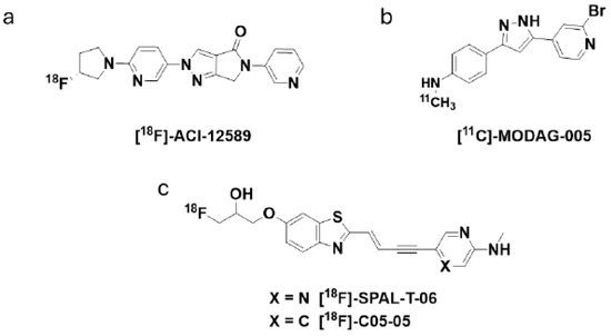 These landmark results have been subsequently confirmed with various compounds, which are structurally distinct from [18F]ACI-12589. [18F]SPAL-T-06 [21], [11C]MODAG-005 [22], and more recently, [18F]C05-05, a compound structurally related to [18F]SPAL-T-06 [23], have provided similar patterns of PET signal distribution as that for [18F]ACI-12589 when tested in patients diagnosed with MSA. The chemical structures of these compounds are shown in Figure 2. The fact that tracers from distinct chemical series provide similar results strongly supports the specificity of the detected signal for their common target, a-synuclein, even in the absence of a neuropathological confirmation at autopsy.