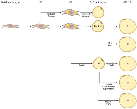 Depiction of (patho)physiologically hypertrophic 3T3-L1 cell models. Using various approaches (I: Reduced Glucose; II: long-term incubation; III: FFAs; IV: Insulin; V: Long-term Incubation + Insulin; VI: long-term incubation + Insulin + M0, M1, or M2 THP1 macrophage supernatant; VII: long-term incubation + Insulin + Tnfα), 3T3-L1 cells were induced to become (patho)physiologically hypertrophic. Created in Biorender. Thor, D. (2025) https://BioRender.com/l205457 (accessed on 1 May 2025).