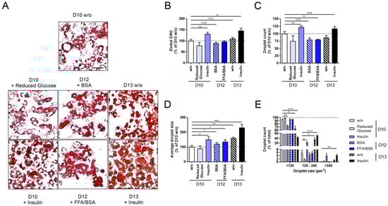 Changes in lipid accumulation of 3T3-L1 adipocytes after glucose restriction, stimulation with free fatty acids (FFAs, only 750 µM palmitate shown) or insulin, or after long-term incubation. 3T3-L1 cells were differentiated under various conditions (glucose restriction, FFA or insulin stimulation, long-term incubation; Figure 1) to induce hypertrophic 3T3-L1 adipocytes. Following this, 3T3-L1 adipocytes were stained with ORO for quantitative and qualitative lipid droplet analysis. As a control, standard differentiated 3T3-L1 cells (D10 w/o) were used. (A) Microscopic pictures of the applied conditions show differences in lipid accumulation (scale bar: 50 µm). (B) For quantification, ORO was eluted from adipocytes and normalized to D10 w/o (OD500 nm–620 nm = 0.51 ± 0.03, n ≥ 3). For qualitative lipid droplet analysis, (C) droplet count (n ≥ 3), (D) average droplet size (n ≥ 3), and (E) lipid droplet size distribution were measured (n ≥ 3). Droplet count and average droplet size were normalized to D10 w/o (ndroplet = 4879 ± 348, Adroplet = 28.15 ± 2.81 µm2). The mean ± SEM of biological replicates is depicted. Significance was tested using a paired Student’s t test (B–D) or two-way ANOVA (E). * p < 0.05, ** p < 0.01, *** p < 0.001, **** p < 0.0001.
