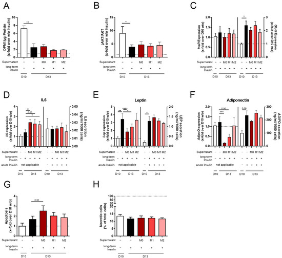 Since we could not analyze the acute co-stimulation of 3T3-L1 adipocytes with insulin and M0, M1, or M2 macrophage supernatant in the secretion studies, the effect of macrophages on physiological hypertrophy in adipocytes (D13 + Insulin) could not be detected.