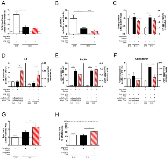 Taken together, (acute) insulin and Tnfα co-stimulation reinforced the effect of D13 + Insulin on insulin sensitivity and reduced adiponectin secretion almost to D10 w/o levels. Further, co-stimulation induced a higher inflammatory state compared to D10 w/o adipocytes. Additionally, genes involved in lipid deposition and lipolysis were regulated similar to in vivo conditions.