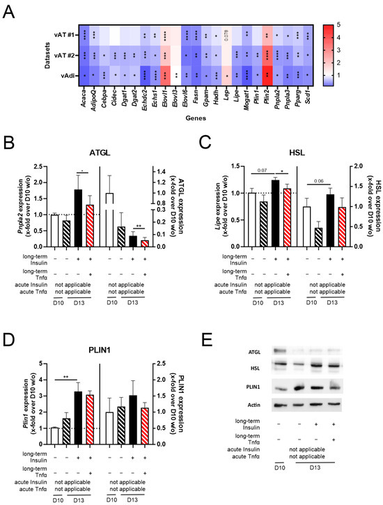 The impact of Tnfα and long-term insulin stimulation on 3T3-L1 adipocytes regarding the expression of additional genes differentially regulated in the adipocytes of lean and obese mice. For further validation of the pathophysiologically hypertrophic characteristics of the cell model (3T3-L1 D13 + Insulin + Tnfα), (A) genes involved in lipid deposition, lipolysis, and adipogenesis were investigated in RNAseq datasets of visceral AT and visceral adipocytes (vAdi). Only differentially expressed genes are shown as a ratio of obese/lean. (B–E) After differentiating 3T3-L1 adipocytes under long-term insulin stimulation until D13 of differentiation, with optional Tnfα stimulation from D10 to D13 (Figure 1), the gene and protein expressions of (B) ATGL (n ≥ 3), (C) HSL (n ≥ 3), and (D) PLIN1 (n ≥ 3) were investigated representatively. One representative Western blot per protein is depicted in (E), whole Western blots are provided in Supplementary Figure S3, and protein expression values are given in Supplementary Table S4. Expression values are shown in Supplementary Table S3. As a control, standard differentiated 3T3-L1 cells (D10 w/o) were used. Gene expression data were normalized to Actb and D10 w/o, and protein expression was normalized to β-actin and D10 w/o. Given is the mean ± SEM of biological replicates. Significant changes were tested using a paired Student’s t test. * p < 0.05, ** p < 0.01, *** p < 0.001, **** p < 0.0001.