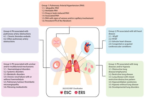 Clinical classification of PH according to 2022 ESC/ERS guidelines. PH is divided into five clinical groups that are further subdivided into subgroups based upon underlying disease mechanisms, clinical presentations, hemodynamic parameters, and therapeutic interventions. ESC: European Society of Cardiology, ERS: European Respiratory Society, HFrEF: heart failure with reduced ejection fraction, HFpEF: heart failure with preserved ejection fraction.