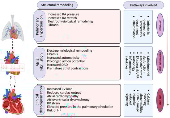 Moreover, little is known about the impact of AF on ventricular and lung function in PH. In patients with severe PH, the elevated pressure in the pulmonary arteries can impact the function of the right atrium. This may result in stretching and enlargement of the atrium, that may create a favorable environment for the onset of AF. Conversely, AF can impair atrial function and contribute to hemodynamic compromises, further worsening the condition of PH [4]. Despite the high clinical relevance, so far, little effort has been made to understand the molecular mechanism, how PH contributes to AF onset, and vice versa. These insights are important for developing patient-tailored treatment strategies. Interestingly, recent research findings disclose that several key molecular pathways, including proteostasis derailment by exhaustion of heat shock proteins, increase DNA damage, autophagy, endothelial dysfunction, inflammation, and oxidative stress underlie AF [21,26,27,28,29,30] as well as PH [31,32,33,34].
