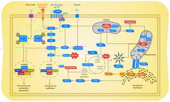 Autophagy, a highly conserved cellular process, plays a crucial role in cardiovascular diseases, particularly in PH and AF [31,42,91]. In various forms of PH, including idiopathic PAH (iPAH) and hypoxia-induced PH, autophagy markers such as light chain 3 (LC3)-B and its activated form LC3B-II are significantly elevated, along with decreased levels of p62, particularly in pulmonary arterial endothelial cells (PAECs) and PASMCs [92,93,94,95,96]. This suggests that autophagy is generally activated in response to PH, possibly contributing to disease progression by promoting vascular remodeling. The mechanistic target of rapamycin (mTOR) pathway plays a crucial role in regulating autophagy in PH, with pulmonary vascular remodeling associated with the downregulation of the mTOR pathway in lung tissues obtained from patients with PAH and in experimental PH animal models [93,97,98,99,100]. Furthermore, recent research has highlighted the role of other key players in autophagy regulation in PH, such as murine double minute 2 (MDM2), which is upregulated in both hypoxia-induced PH mouse models and kippah patients, leading to the degradation of angiotensin-converting enzyme 2 (ACE2), a key AMPK-dependent regulator in vasoconstriction [101]. In Group 1 PH patients, recent studies show that NLR-family pyrin domain containing 3 protein (NLRP3) activation exacerbates vascular remodeling, smooth muscle proliferation, and right ventricular fibrosis [102,103]. Additionally, hypoxia-inducible factor 1-alpha (HIF-1α) has been shown to induce pathological vascular remodeling in PAH by regulating autophagy-related genes [104,105].