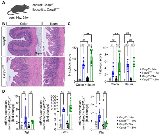 3.1. Casp8ΔIEC Mice Develop Ileocolitis and Extraintestinal Inflammation