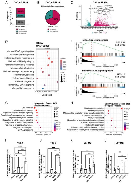 Differential gene expression analysis of the T98-G cells after dual DNMT1 and HDACs inhibition. (A) Bar plot of the percentage of genes upregulated, downregulated, or not regulated after the DNMT1 and HDACs inhibition in the T98-G cells (abs FC ≥ 2, p adj ≤ 0.05). (B) Pie chart of the differentially expressed genes after the combinatory DNMT1 and HDACs inhibition in the T98-G cells with respect to the control (abs FC ≥ 2, p adj ≤ 0.05). (C) Volcano plot of the differentially expressed genes after the DNMT1 and HDACs inhibition in the T98-G cells with respect to the control. (D) Gene Set Enrichment Analysis (GSEA) of the cancer hallmark gene sets from MSigDB in the T98-G cells treated with both DAC and SB939. (E,F) GSEA of spermatogenesis (E) and KRAS signaling down (F) signatures in the T98-G cells treated with both DAC and SB939. Bars represent individual genes in the ordered gene set list. The GSEA was performed by implementing the clusterProfiler package in R Studio. (version 2023.06.2+561). (G,H) Gene Ontology analysis of biological process categories enriched for upregulated (G) and downregulated genes (H) performed by using the topGO package in the R environment. The p value was calculated with the weighted Fisher’s exact test. (I,J) Quantitative RT-PCR of TIAM1 (I) and DUSP1 (J) gene expressions after the DNMT1 and/or HDACs inhibition in the T98-G cells. (K,L) Quantitative RT-PCR of the TIAM1 (K) and DUSP1 (L) gene expressions after the DNMT1 and/or HDACs inhibition in the U87-MG cells. The results are expressed as . The data are expressed as the mean ± SD, * p value ≤ 0.05; ** p value ≤ 0.01; *** p value ≤ 0.001; **** p value ≤ 0.0001; test—unpaired two tailed t-test of treated samples vs. vehicle, corrected for multiple testing with the Bonferroni method.