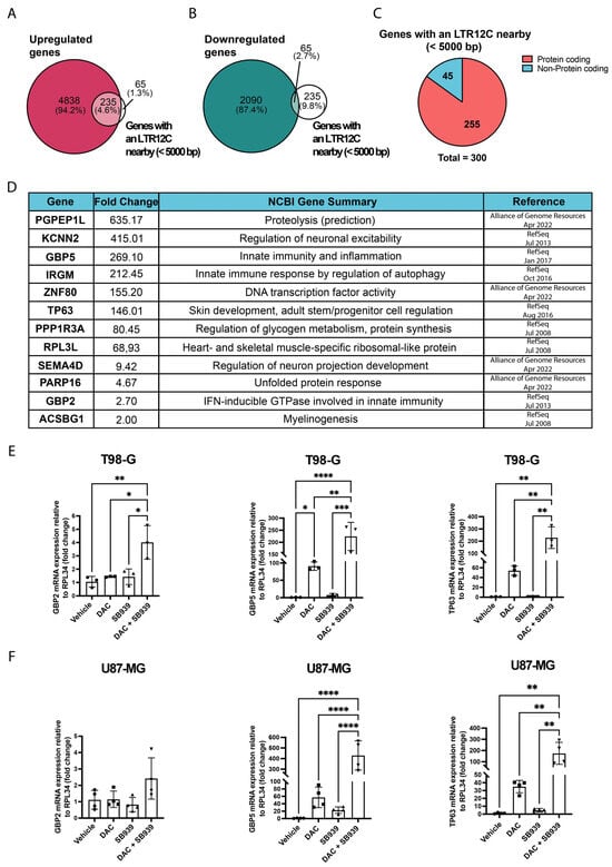 Dual DNMT1 and HDACs inhibition induced the expression of LTR12C-driven genes in the GBM cell models. (A) Overlap between the genes upregulated by cotreatment with DAC and SB939 in the T98-G cells and the genes that presented an LTR12C nearby (<5000 bp). (B) Overlap between the genes downregulated by the cotreatment with DAC and SB939 in the T98-G cells and the genes that presented a LTR12C nearby (<5000 bp). (C) Pie chart of protein coding and non-protein coding genes near to a LTR12C (<5.000 bp) and deregulated by the double inhibition of DNMT1 and HDACs in the T98-G cells. (D) Table of genes with an LTR12C that overlapped their TSSs and was deregulated after the cotreatment with DAC and SB939. KCNN2, PPP1R3A, and ACSBG1 were also found on the list provided by Othani et al. (E) Quantitative RT-PCR analysis of the GBP2, GBP5, and TP63 mRNA expression levels in the T98-G cells treated with 500 nM DAC and/or 500 nM SB939. (F) Quantitative RT-PCR analysis of the GBP2, GBP5, and TP63 global mRNA expressions in the U87-MG cells treated with 500 nM DAC and/or 500 nM SB939. The results are expressed as . The data are expressed as the mean ± SD, * p value ≤ 0.05; ** p value ≤ 0.01; *** p value ≤ 0.001; **** p value ≤ 0.0001; test—unpaired two tailed t-test of treated samples vs. vehicle, corrected for multiple testing with the Bonferroni method.