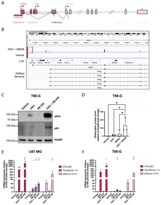 DNMT1 and HDACs combined inhibition induced the GTA-p63 expression at the mRNA and protein levels in glioblastoma cell lines. (A) Schematic representation of the TP63 gene locus, showing three different alternative promoters (GTA, TA, and ΔN) and the position of primers used for the RT-qPCR analyses. (B) Gene body coverage of the RNA-seq reads on TP63 first exons in the T98-G cells treated with DAC and SB939 or vehicle shows that these drugs induced LTR12C-driven GTA-p63 expression, as visualized on IGV software. (C,D) Representative Western blot analysis of the p63 protein levels in T98-G after the treatment with 500 nM DAC and/or 500 nM SB939 for 96 h. (D) Densitometric analysis of C, performed with ImageJ (1.3K) software. (E,F) Quantitative RT-PCR analysis of GTA-p63, TA-p63α, and global TP63α levels in U87-MG (E) and T98-G (F) cells treated with 500 nM DAC and/or 500 nM SB939 for 96 h. The results are expressed as . The data are expressed as the mean ± SD, * p value ≤ 0.05; *** p value ≤ 0.001; **** p value ≤ 0.0001; test—unpaired two tailed t-test of treated samples vs. vehicle, corrected for multiple testing with the Bonferroni method.