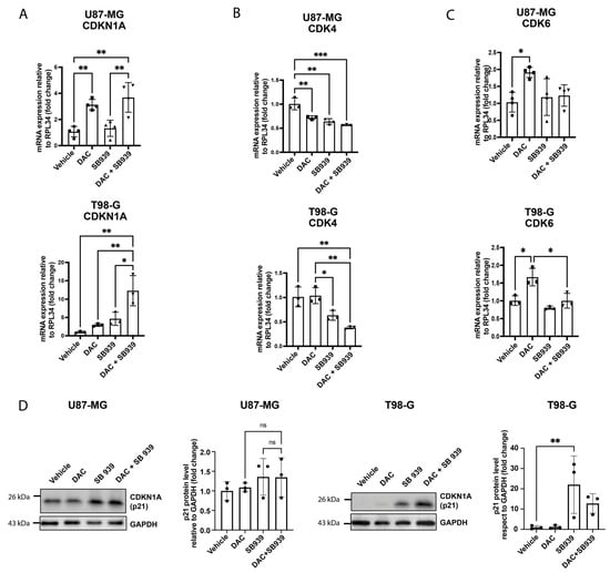 For this reason, we decided to investigate how the DNMT1 and HDAC combined inhibition could act on this pathway and whether the two drugs produced different effects than the individual treatments. To do this, we evaluated the expression levels of p21, CDK4, and CDK6 by qRT-PCR. The results show that the co-treatment with DAC and SB939 induced p21 expression at the mRNA level in both the U87-MG and T98-G cell lines (Figure 4A), with 4- and 12-fold increases, respectively. In the U87-MG cells, the treatment with DAC increased the p21 expression by 3 times compared with the control cells (Figure 4A), whereas in the T98-G cells, only the double treatment was able to increase the p21 expression by 12 times (Figure 4A). The CDK4 gene expression was downregulated after the double treatment by 0.44 times in the U87-MG and 0.62 times in the T98-G cells (Figure 4B,C), while CDK6 was not affected at all after the combinatory treatment with epi-drugs (Figure 4B,C). At the protein level, we observed a significant upregulation of p21 in the T98-G cells treated with SB939 alone, and a trend towards increased expression in samples treated with the combination of the two drugs (Figure 4D). However, this effect was not recapitulated in the U87-MG cell line (Figure 4D). Taken together, these results show that the inhibition of DNMT1 and HDACs affected the expression of downstream effectors of TP63, such as p21, at least at the mRNA level, which possibly contributed to the cell cycle regulation.
