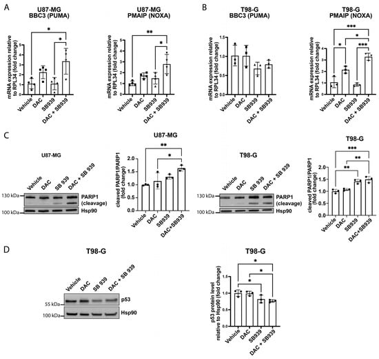 DNMT1 and HDAC combinatory inhibition induced the expression of pro-apoptotic genes. (A,B) Quantitative RT-PCR of BBC3 (PUMA) and PMAIP (NOXA) mRNA expression levels after the treatment with 500 nM DAC and/or 500 nM SB939 in the U87-MG (A) and T98-G (B) cells. The results are expressed as . (C) Representative Western blot and densitometric analysis of the PARP1 protein cleavage after the treatment with 500 nM DAC and/or 500 nM SB939 in the U87-MG (left) and T98-G (right) cells. (D) Representative Western blot analysis of the p53 protein expression level after the treatment with 500 nM DAC and/or 500 nM SB939 in the T98-G cells (left) and densitometric analysis (right). The data is expressed as the mean ± SD, * p value ≤ 0.05; ** p value ≤ 0.01; *** p value ≤ 0.001; test—unpaired two tailed t-test of treated samples vs. vehicle, corrected for multiple testing with the Bonferroni method.