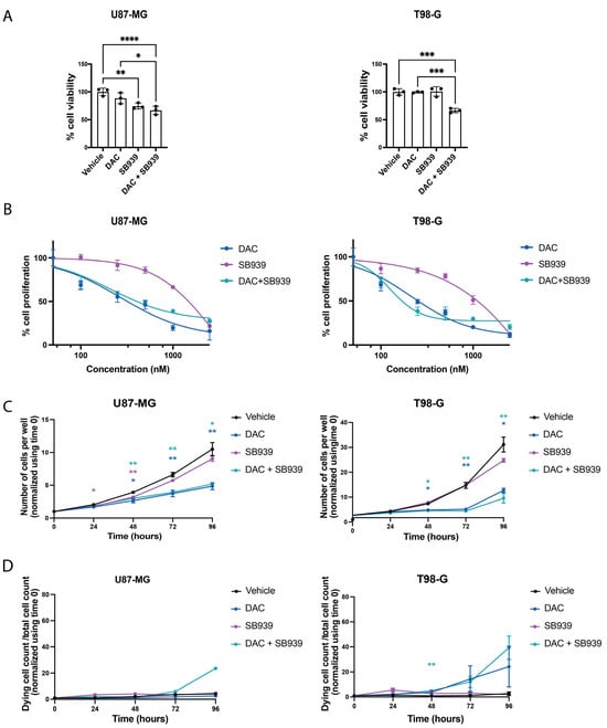 Dual inhibition of DNMT1 and HDACs reduced the cell viability in the two glioblastoma cell models. (A) MTS analysis of the U87-MG (left) and T98-G (right) cells treated with 500 nM DAC and/or 500 nM SB939 for 96 h. (B) Dose–response curves of DAC, SB939, and DAC and SB939 in the U87-MG (left) and T98-G (right) cells treated for 96 h. The percentage of cell proliferation was calculated from Incucyte Live-Cell Analysis data as the percentage of the ratio of cell number of treated samples over the cell number of the control group. (C) Incucyte® Live-Cell Analysis of the U87-MG and T98-G cells during treatment with 500 nM DAC and/or 500 nM SB939 for 96 h. (D) Incucyte® Live-Cell Analysis of the numbers of dying U87-MG and T98-G cells during the treatments with 500 nM DAC and/or 500 nM SB939 for 96 h. The data are expressed as the mean ± SD, * p value ≤ 0.05; ** p value ≤ 0.01; *** p value ≤ 0.001; **** p value ≤ 0.0001; test—unpaired two tailed t-test of treated samples vs. vehicle for each time point, corrected for multiple testing with the Bonferroni method.