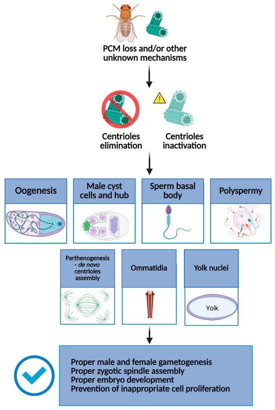 Schematic representation of how, in Drosophila, centrioles are eliminated or inactivated at key stages of development and cellular differentiation. In particular, centrioles are eliminated or inactivated during oogenesis, spermiogenesis, and parthenogenesis during the early stages of embryo development. Centrioles are also inactivated in differentiated cells, such as ommatidia. These processes are essential to prevent aberrant cell divisions, ensure proper gametogenesis, and support normal embryonic development. Created in BioRender, https://BioRender.com/37eu8sg (accessed on 21 May 2025).