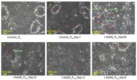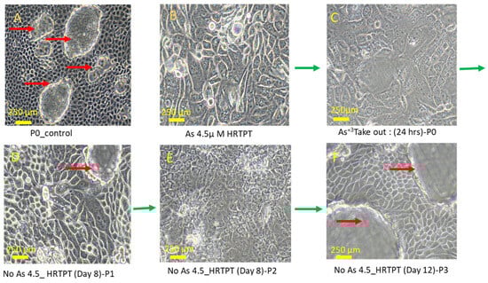 Light microscopic images of As3+-removed HRTPT cells from i-As (III)-exposed cells; (A) unexposed control; (B) i-As (III)-exposed HRTPT cells; (C) i-As (III)-removed cells for 24 h (P0); (D) P1 i As (III)-removed cells; (E) P2 i-As (III)-removed cells; (F) P3 i-As (III)-removed cells. The green arrow indicates images of i-As (III)-removed passages; scale bar = 500 µm and magnification 20×. Red arrows show the presence of domes, and green arrows show the chronology of arsenic removal from chronic arsenite-exposed cells (B–F).