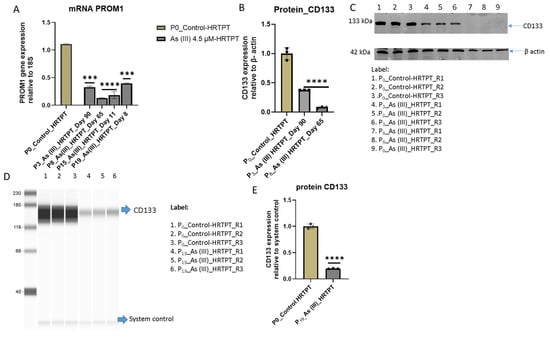 mRNA and protein level of PROM1 in HRTPT cell lines treated with 4.5 µM of i-As up to P19 passages. (A) mRNA PROM1-RT-qPCR analysis, (B) protein CD133 analysis (quantification from image C), (C) Western blot, (D) capillary Western/Jess of CD133, (E) protein CD133 analysis (quantification from image D); the expression of the PROM1 gene was normalized to the 18S housekeeping gene. While the expression of the CD133 protein was normalized to β-actin in the Western blot and to the system control in the capillary Western. Protein expression in (D) was also normalized to the Jess system control. The measurements were performed in triplicate for gene and protein data. The reported values are mean ± SEM. A one-way ANOVA was performed, and **** and *** indicate significant differences in gene/protein expression level compared to the control (0.0 µM arsenite concentration at p-value of ≤0.0001; ≤0.001, respectively).