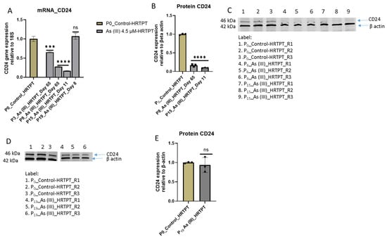 mRNA and protein level of CD24 in HRTPT cell lines treated with 4.5 µM of i-As (III) up to P19 passages. (A) mRNA_CD24-RT-qPCR analysis, (B,E) protein analysis of CD24, (C,D) Western blot of CD24 The expression of the CD24 gene and the protein were normalized to the 18S housekeeping gene and β-actin, respectively. The measurements were performed in triplicate for gene and protein data. The reported values are mean ± SEM. A one-way ANOVA was performed, and **** and *** indicate significant differences in gene/protein expression level compared to the control (0.0 µM arsenite concentration at p-value of ≤0.0001; ≤0.001, respectively). “ns” indicates non-significant.
