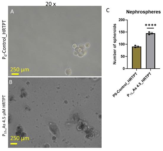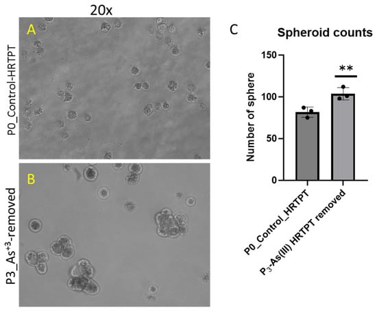 Light-level microscopy of spheroids generated from control-HRTPT and P3 i-As (III)-removed-HRTPT cells. The spheroid images taken at 20× magnification generated from (A) control-HRTPT cells; (B) P3_i-As (III)-removed-HRTPT cells; and (C) bar graph shows number of sphere; ** indicates significant differences in number of spheres compared to the control (0.0 µM arsenite concentration at p-value of ≤ 0.01). All the images were taken after 28 days of seeding in the ultra-low attachment flasks.
