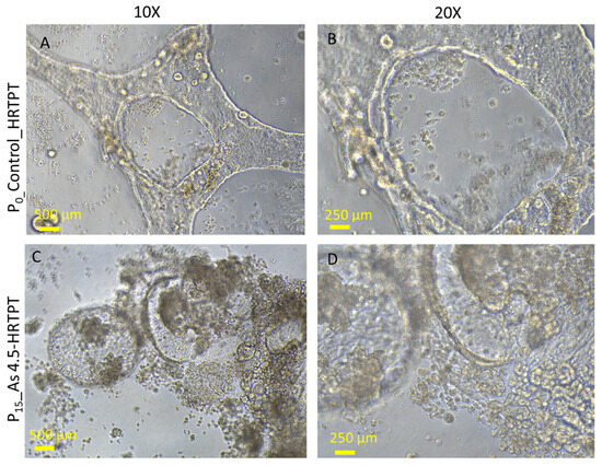 Light-level microscopy of Control-HRTPT and i-As (III) 4.5 µM-HRTPT (P15) cells plated on the surface of a thin Matrigel-coated 48-well plate. (A,B) HRTPT control; (C,D) As 4.5 µM-HRTPT-P15 grown on the surface of the Matrigel coat. All images were taken at 10× and 20× magnification.