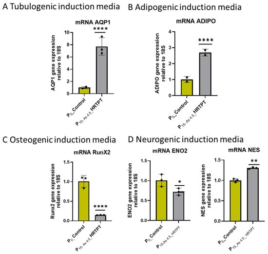 mRNA level of cell-type-specific differentiation markers in Control-HRTPT and P15-As 4.5 µM HRTPT. (A) mRNA_AQP1 (tubulogenic cell differentiation marker)-RT-qPCR analysis and (B) mRNA-ADIPO (adipogenic cell differentiation marker)-RT-qPCR analysis, (C) mRNA RunX2 (osteogenic induction marker)-RT-qPCR analysis, (D) mRNA_NES and ENO2 (neurogenic cell differentiation marker). Gene expression was normalized to the 18S housekeeping gene. The measurements were performed in triplicate for gene data. The reported values are mean ± SEM. A t-test was performed, and asterisks indicate significant differences from the control (* p < 0.05, ** p < 0.01, **** p < 0.0001).
