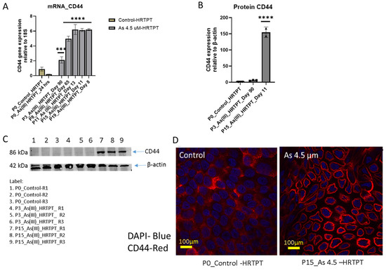mRNA and protein level of CD44 markers in HRTPT cell lines exposed to 4.5 µM of i-As (III) up to P19 passages. (A) mRNA_CD44-RT-qPCR analysis; (B,C) protein_CD44-Western analysis; (D) immunofluorescence of CD44 control vs i-As (III)-exposed cells (P15); expression of the CD44 gene and the protein was normalized to the 18S housekeeping gene and β-actin, respectively. The measurements were performed in triplicate for gene and protein data. The reported values are mean ± SEM. A one-way Anova was performed, and **** and *** indicate significant differences in gene/protein expression level compared to the control (0.0 µM arsenite concentration at p-value of ≤0.0001; ≤0.001, respectively).