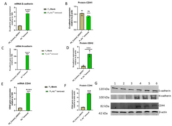 mRNA and protein level of EMT markers in HRTPT cell lines after removal of arsenite vs. non-I-As (III) exposure control. (A) mRNA_E-cadherin-RT-qPCR analysis and (B,G) protein_CDH1–Western blot analysis, (C) mRNA_N-cadherin-RT-qPCR analysis (D,G) protein_CDH2-Western blot analysis, (E) mRNA_CD44-RT-qPCR analysis (F,G) protein_CD44-Western blot analysis. Gene expression was normalized to the 18S housekeeping gene. The measurements were performed in triplicate for gene data. The reported values are mean ± SEM. A t-test was performed for mRNA and protein, respectively. Asterisks indicate significant differences from the control (*** p < 0.001, **** p < 0.0001). “ns” indicates non-significant.