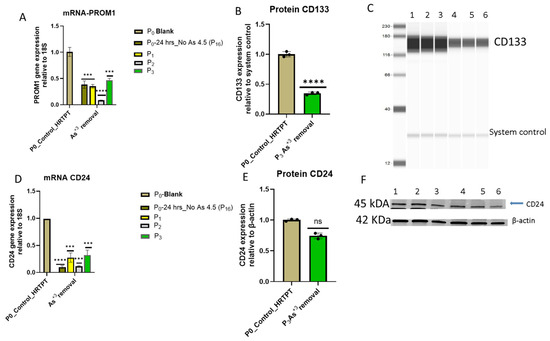 mRNA and protein level of progenitor markers in HRTPT cell lines after removal of arsenite vs. non-arsenite exposure. (A) mRNA_CD133- RT-qPCR analysis and (B,C) protein_CD133 -Jess analysis; (D) mRNA_CD24- RT-qPCR analysis; (E,F) protein_CD24-Western blot analysis; gene expression was normalized to the 18S housekeeping gene. The measurements were performed in triplicate for gene data. The reported values are mean ± SEM. A one-way ANOVA and t-test were performed for mRNA and protein, respectively. Asterisks indicate significant differences from the control (*** p < 0.001, **** p < 0.0001). “ns” indicates non-significant.