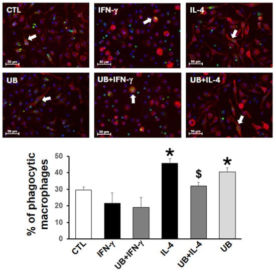 Exogenous UB affects efferocytosis of macrophages. Peritoneal macrophages, pretreated with UB (20 µg/mL) for 30 min, were treated with IFN-γ (100U/mL; M1 polarization) or IL-4 (20 ng/mL; M2 polarization) for 72 h. Cells were then incubated overnight with PKH67-labeled apoptotic neutrophils (green) and then immune-stained with anti-F4/80 antibodies (red). Nuclei were stained using Hoechst (blue). Images, captured using EVOS m7000 microscope, were analyzed using Nikon-NIS Elements software. White arrows indicate macrophages with engulfed apoptotic neutrophils. Data were analyzed using one-way ANOVA followed by a post hoc Tukey’s test. * p < 0.05 vs. CTL; $ p < 0.05 vs. IL-4; n = 3. The comparison groups were CTL, IFN-γ, UB+IFN-γ, and UB; and CTL, IL-4, UB+IL-4, and UB.