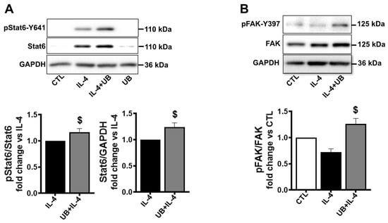 Exogenous UB affects STAT6 and FAK activation in M2-polarized macrophages. Peritoneal macrophages, pretreated with UB (20 µg/mL) for 30 min, were treated with IL-4 (20 ng/mL; M2 polarization) for 72 h. Cell lysates were analyzed by Western blot using anti-p-STAT6, STAT6, p-FAK, FAK, and GAPDH antibodies. After protein transfer, the membrane was cut into two portions. The upper portion, above the ~70 kDa marker, was probed for p-STAT6 or p-FAK, while the lower portion was probed for GAPDH. After stripping the upper portion, the membrane was probed for STAT6 or FAK. (A) The upper panel exhibits immunoblotting for p-STAT6, STAT6, and GAPDH. (B) The upper panel exhibits immunoblotting for p-FAK, FAK, and GAPDH. The lower panels (A,B) exhibit quantitative analyses normalized to STAT6, FAK, or GAPDH. Data were analyzed using a two-tailed Student’s t test or one-way ANOVA followed by a post hoc Tukey’s test. $ p < 0.05 vs. IL-4; n = 3–6.