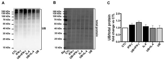 Exogenous UB had no effect on ubiquitination of cellular proteins. Peritoneal macrophages, pretreated with UB (20 µg/mL) for 30 min, were treated with IFN-γ (100 U/mL; M1 polarization) or IL-4 (20 ng/mL; M2 polarization) for 72 h. Cell lysates were analyzed by Western blot using anti-UB antibodies. (A) UB immunostaining. (B) Total protein stain. (C) Quantitative data for the ubiquitinated proteins normalized to total protein staining (entire lane). Data were analyzed using one-way ANOVA followed by a post hoc Tukey’s test. n = 3–4; Std, standard. The comparison groups were CTL, IFN-γ, UB+IFN-γ, and UB; and CTL, IL-4, UB+IL-4, and UB.